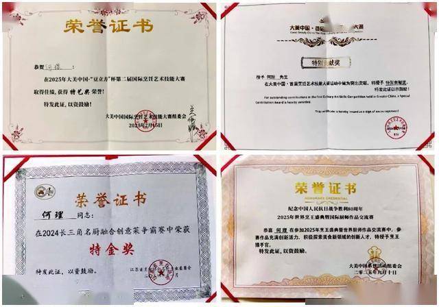 他持续在竞技中精进,如“葡萄鱼爆品王特金奖”“长三角名厨融合创意菜争霸赛特金奖”等奖项,证明其技艺始终处于动态发展与时代前沿。