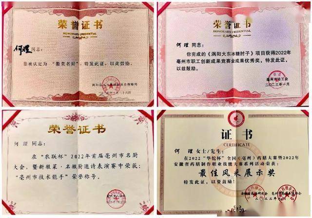 2024年:涡阳县人力资源和社会保障局授予徽菜名厨。2024年:中共涡阳县委农村工作领导小组办公室授予涡阳县乡村工匠,授予特别贡献奖。2024年:中国食文化名店名厨爆品王,精英挑战赛授予葡萄鱼特金奖。2024年:中国食文化名店名厨爆品王,精英挑战赛授予冰糖肘子爆品王。2024年:江苏省烹饪协会名厨专业委员会授予长三角名厨融合创意菜争霸赛特金奖。