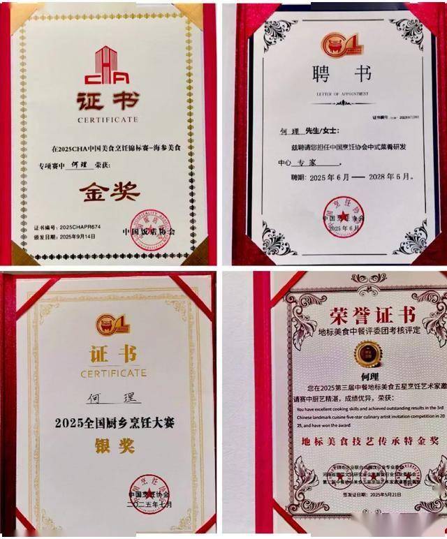 2025年:“大美中国·‘豆立方’杯第二届国际烹饪艺术技能大赛”组委会授予特艺奖。2025年:中国食文化研究会餐饮连锁文化专业委员会授予小龙虾爆品王特金奖。2025年:平顶山市餐饮行业协会等机构授予地标美食技艺传承特金奖。2025年:大美中国系列活动组委会授予烹王猎手官。2025年:中国烹饪协会授予中国烹饪协会中式菜肴研发中心专家。2025年:中国烹饪协会授予2025全国厨乡烹饪大赛银奖。2025年:中国饭店协会授予2025CHA中国美食烹饪锦标赛-海参美食专项赛金奖。2025年:亳州市文化旅游体育局授予“超级皖”美食争霸赛亳州赛区选拔赛暨“亳膳养天下”美食嘉年华二等奖。