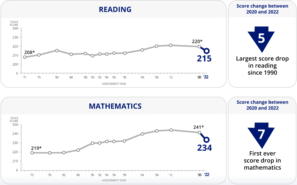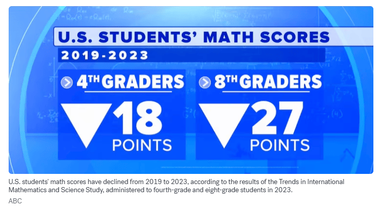 TIMSS(国际数学和科学趋势研究)报告显示,2019—2023年间,美国四年级学生的数学成绩下降18分,八年级下降27分,几乎抹去了过去30年的进步。
