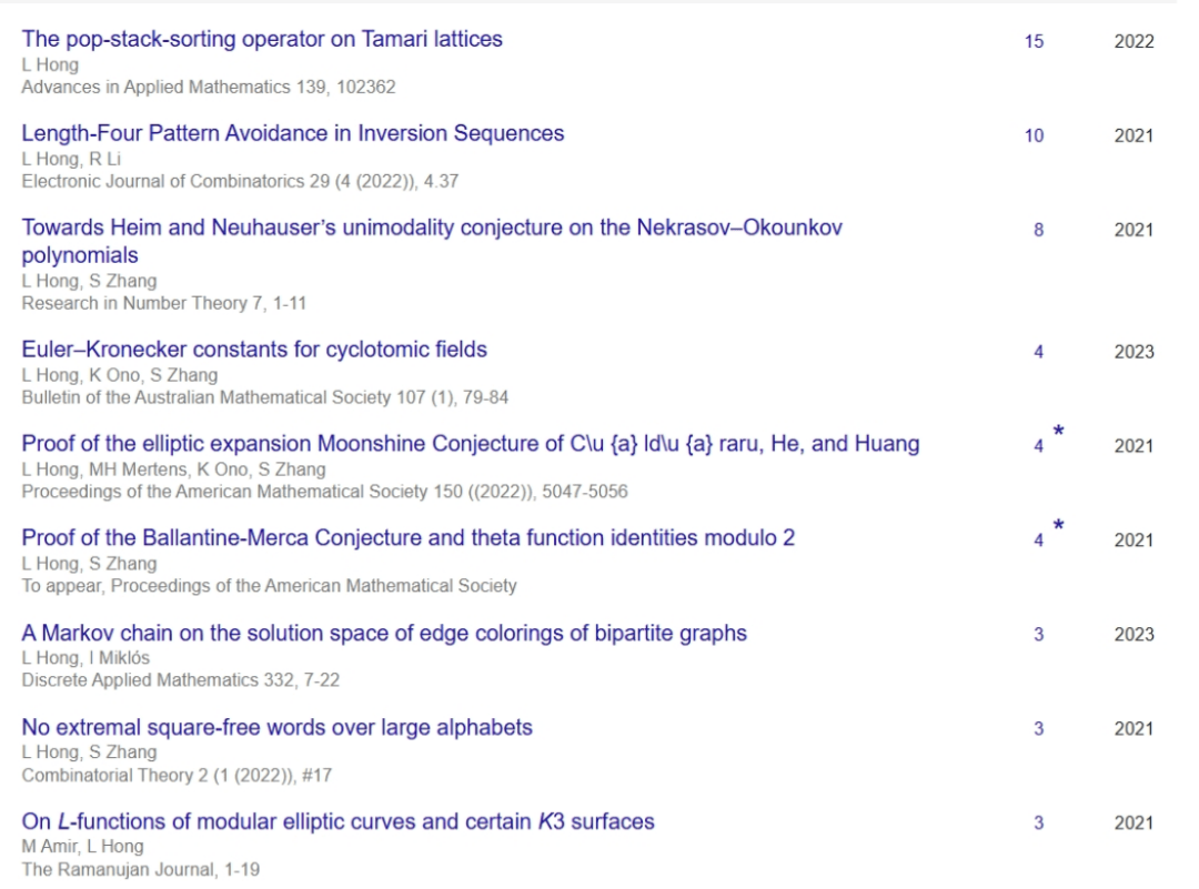 本科阶段,她在《Proc. Amer. Math. Soc.》《J. Number Theory》等期刊发表9篇论文,主题涵盖分拆同余、模形式与组合计数。