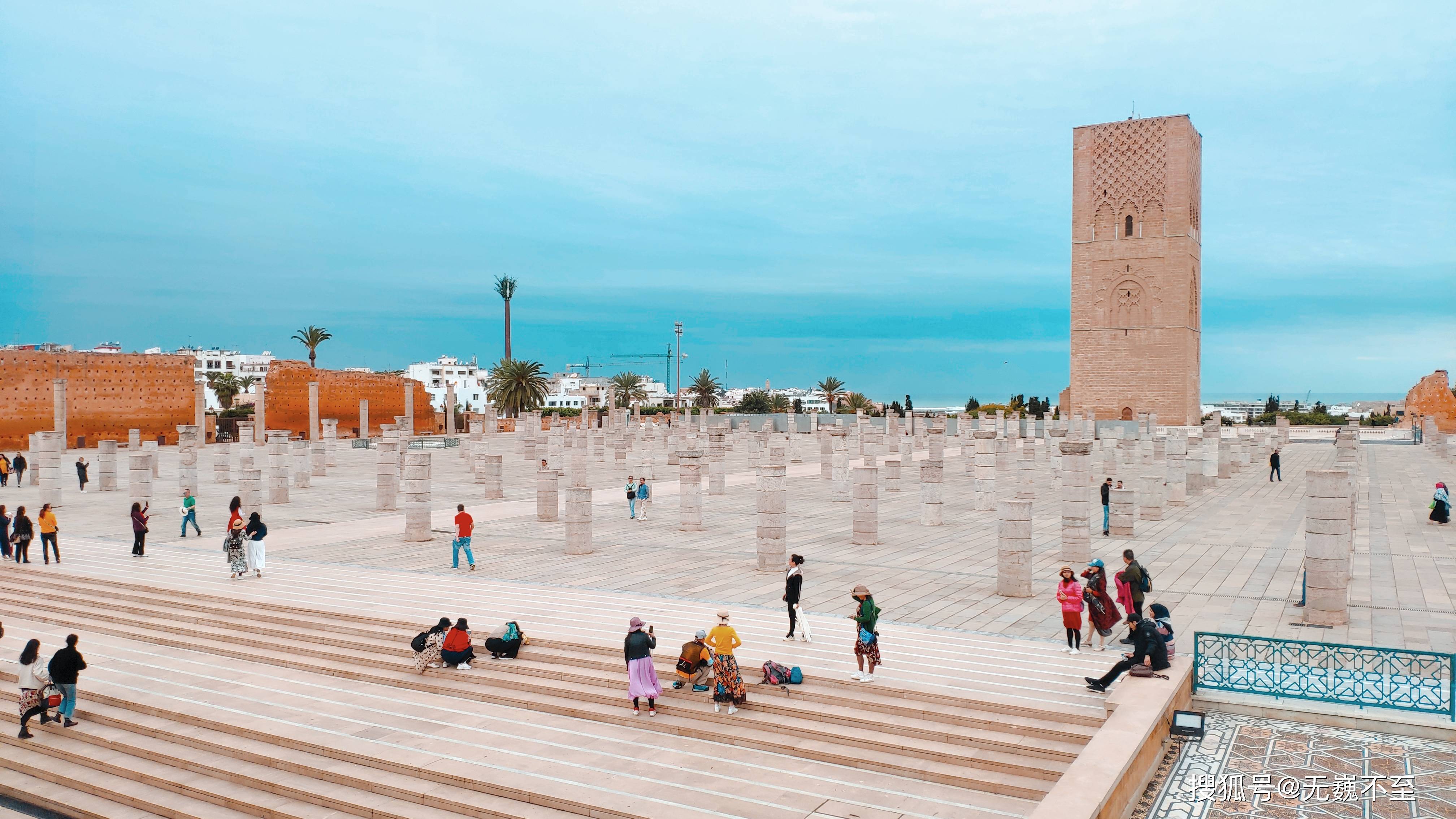 宽敞的广场尽头一眼可望见蔚蓝的大西洋,312根高矮不一的圆石柱墩依然簇拥着半截哈桑塔和布满孔洞的夯土墙泪眼守望,它们用令人心悸的残缺美诉说着沧桑凄凉,游客们也喜欢在这些保存着历史记忆的残垣断柱前拍照留念。
