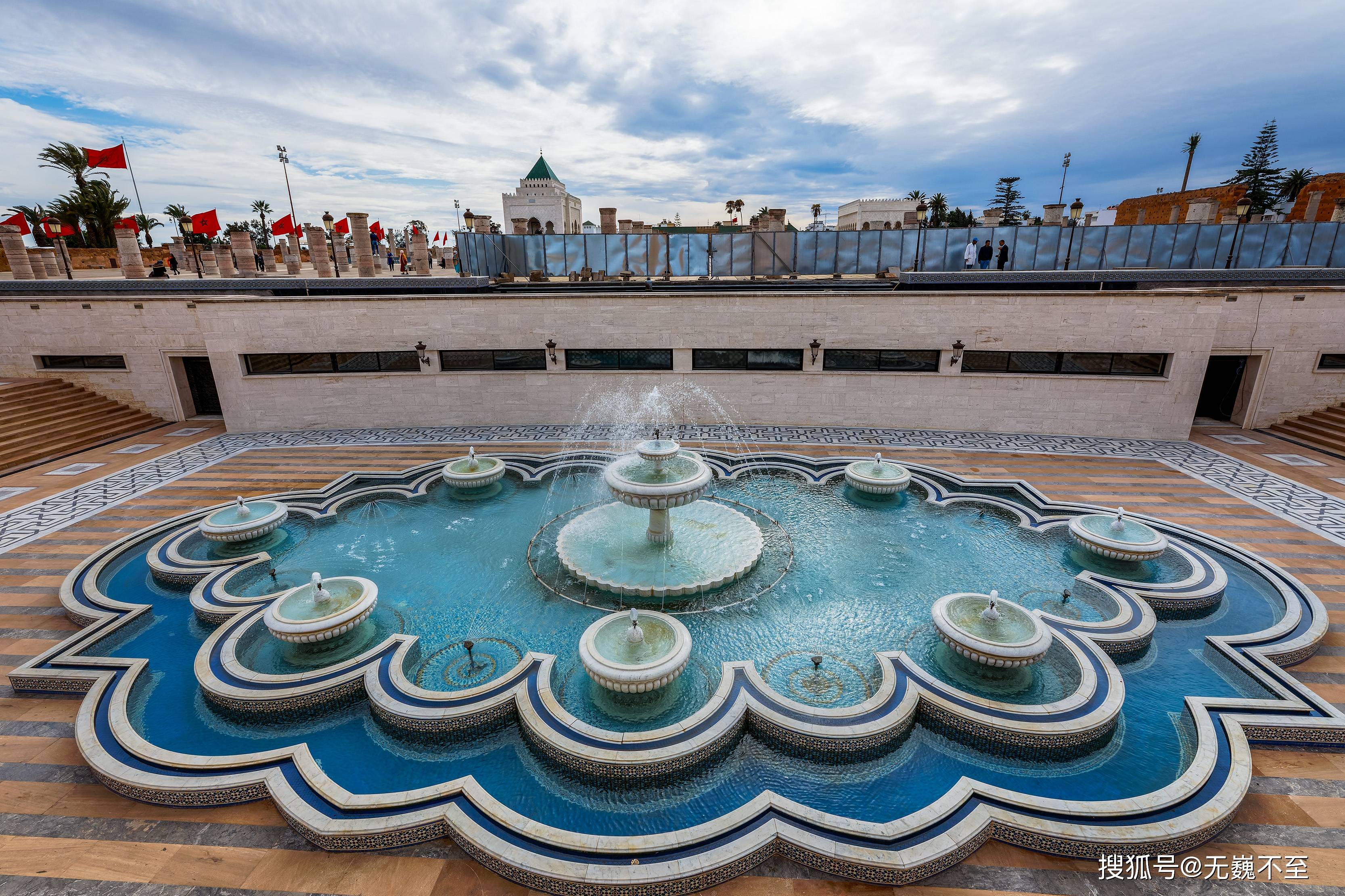 在广场的西北端,有一个小型的下沉式广场,内有一座精美的喷水池,不过估计是近代修建的。喷水池由八个白色大理石雕琢的圆形台状喷池组成莲花状,花蕊部分是同样材质的三层塔式喷水池,池底镶嵌着摩洛哥最顶级的马赛克,黄白蓝绿间杂,碧波荡漾其间,素雅且美轮美奂,既突出了伊斯兰特色,又彰显了阿拉维王朝的建筑风格。