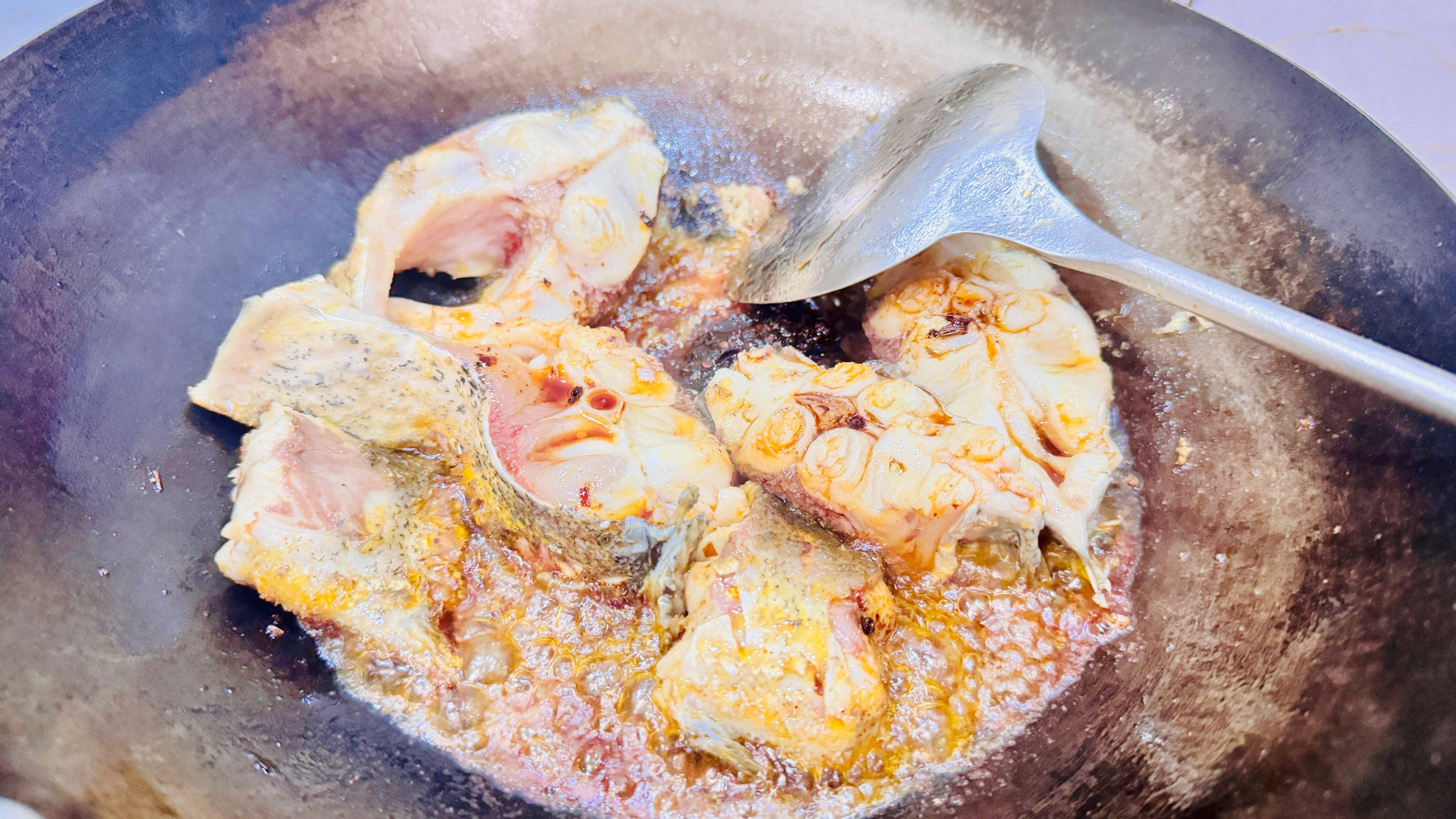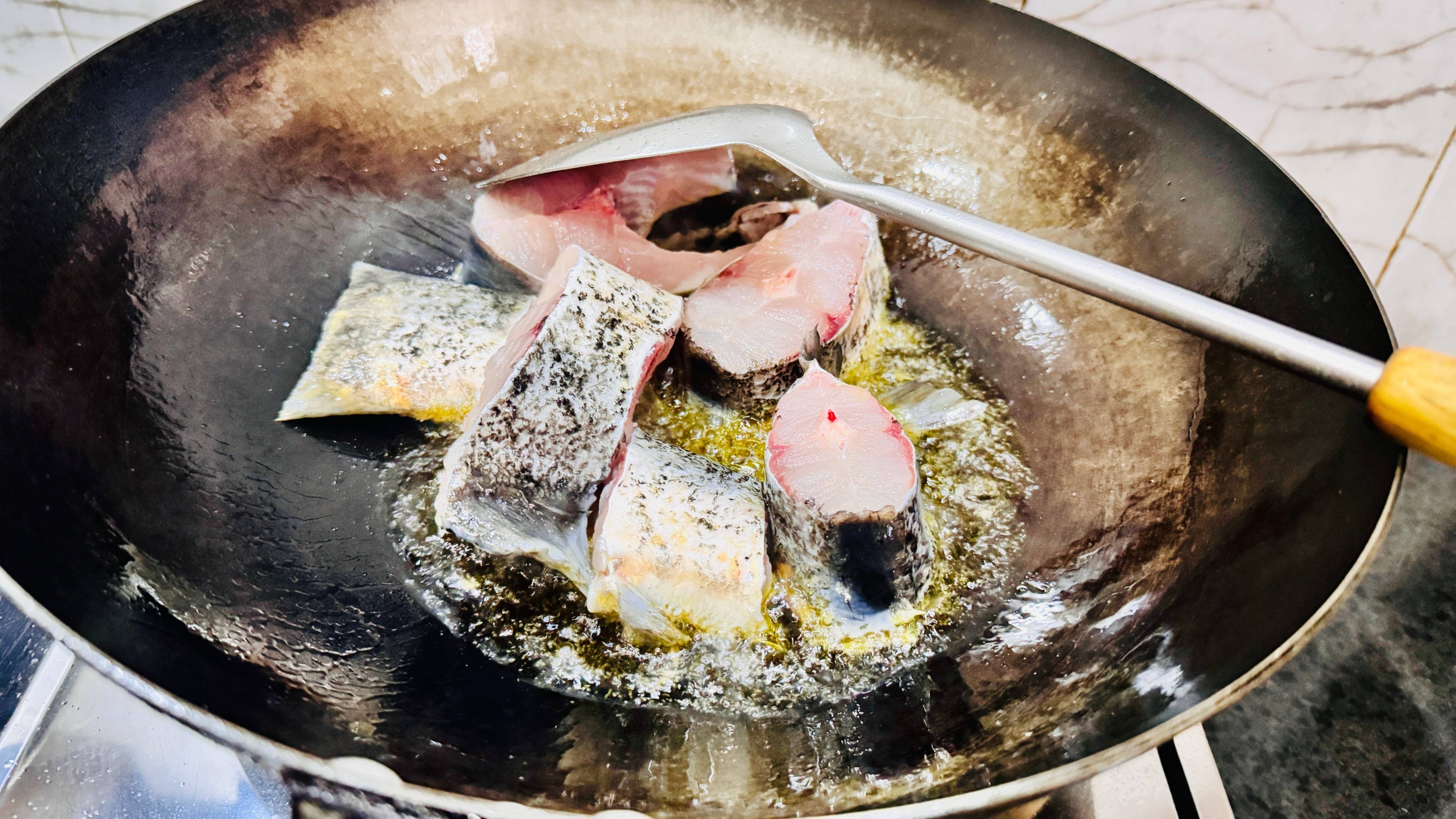 鱼块洗干净沥干水分,起油锅,先把鱼块煎一下。