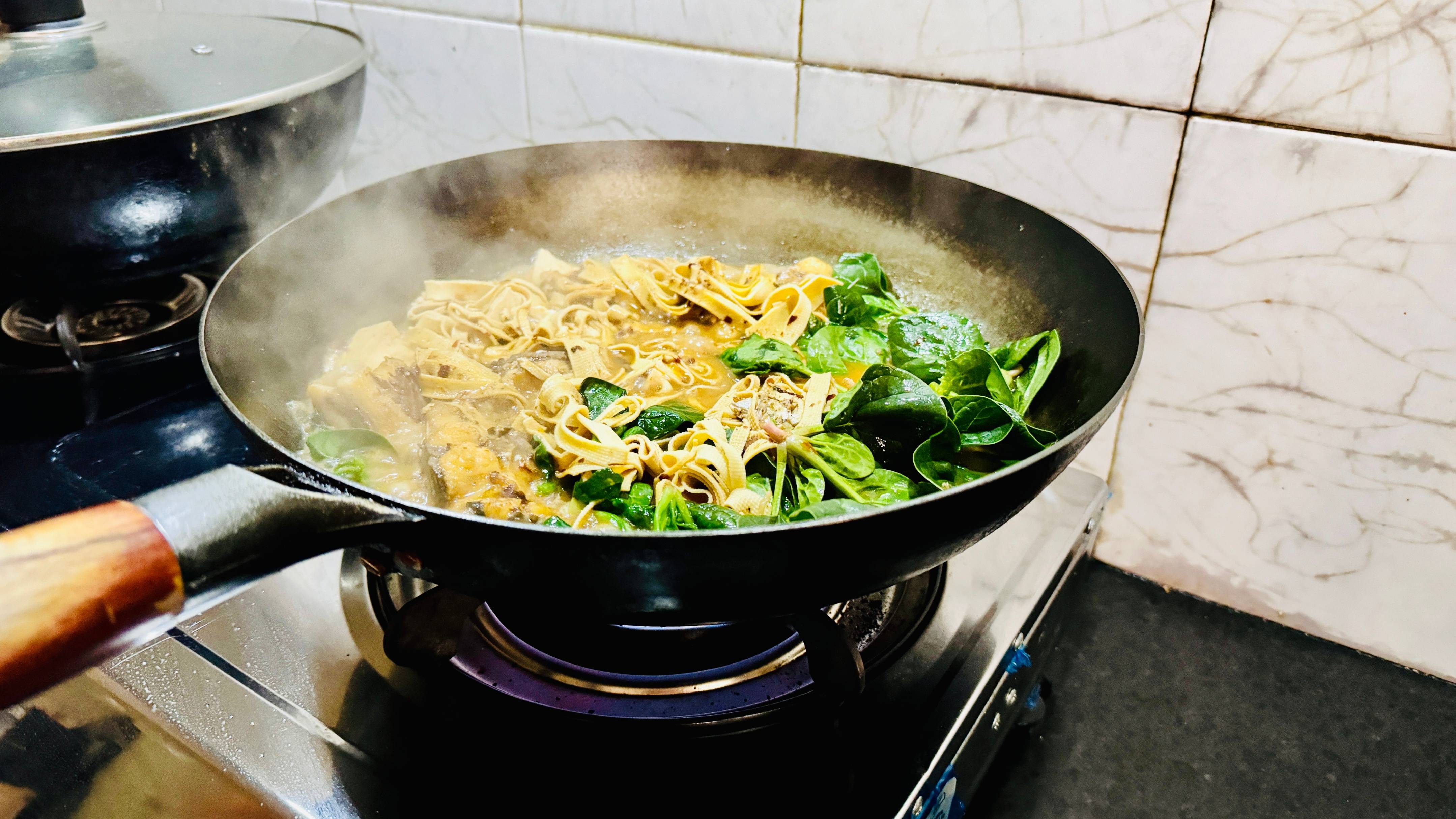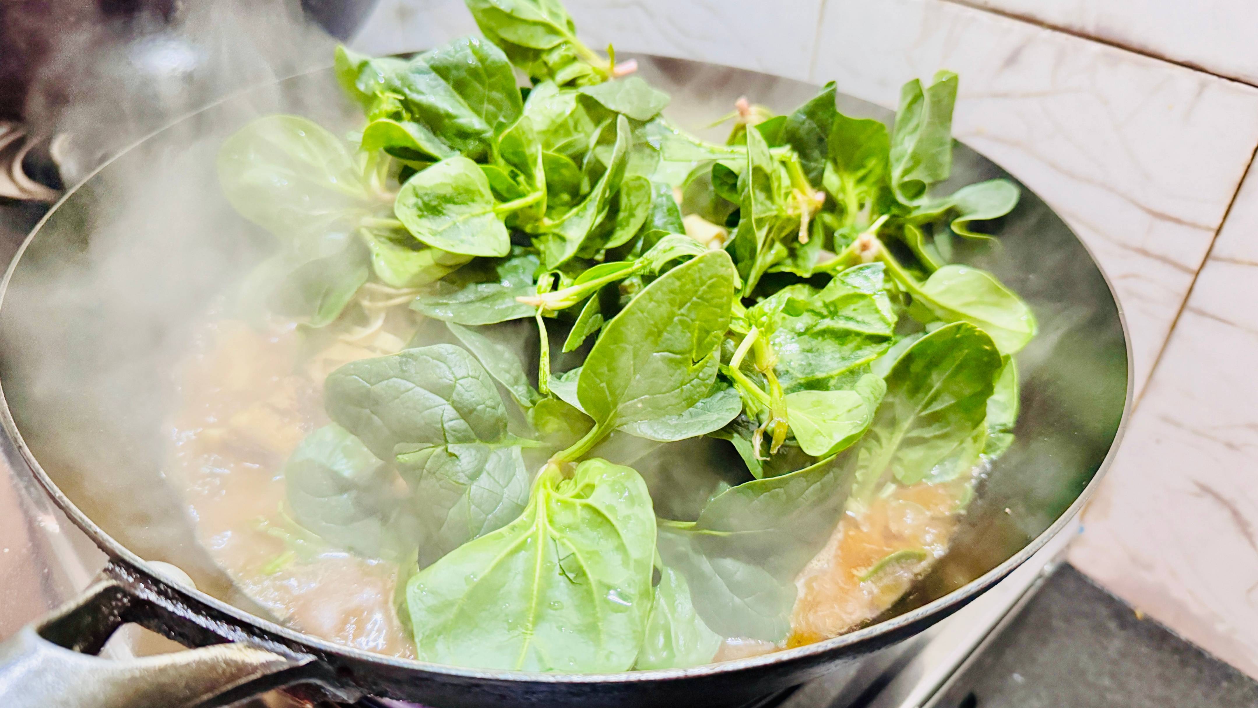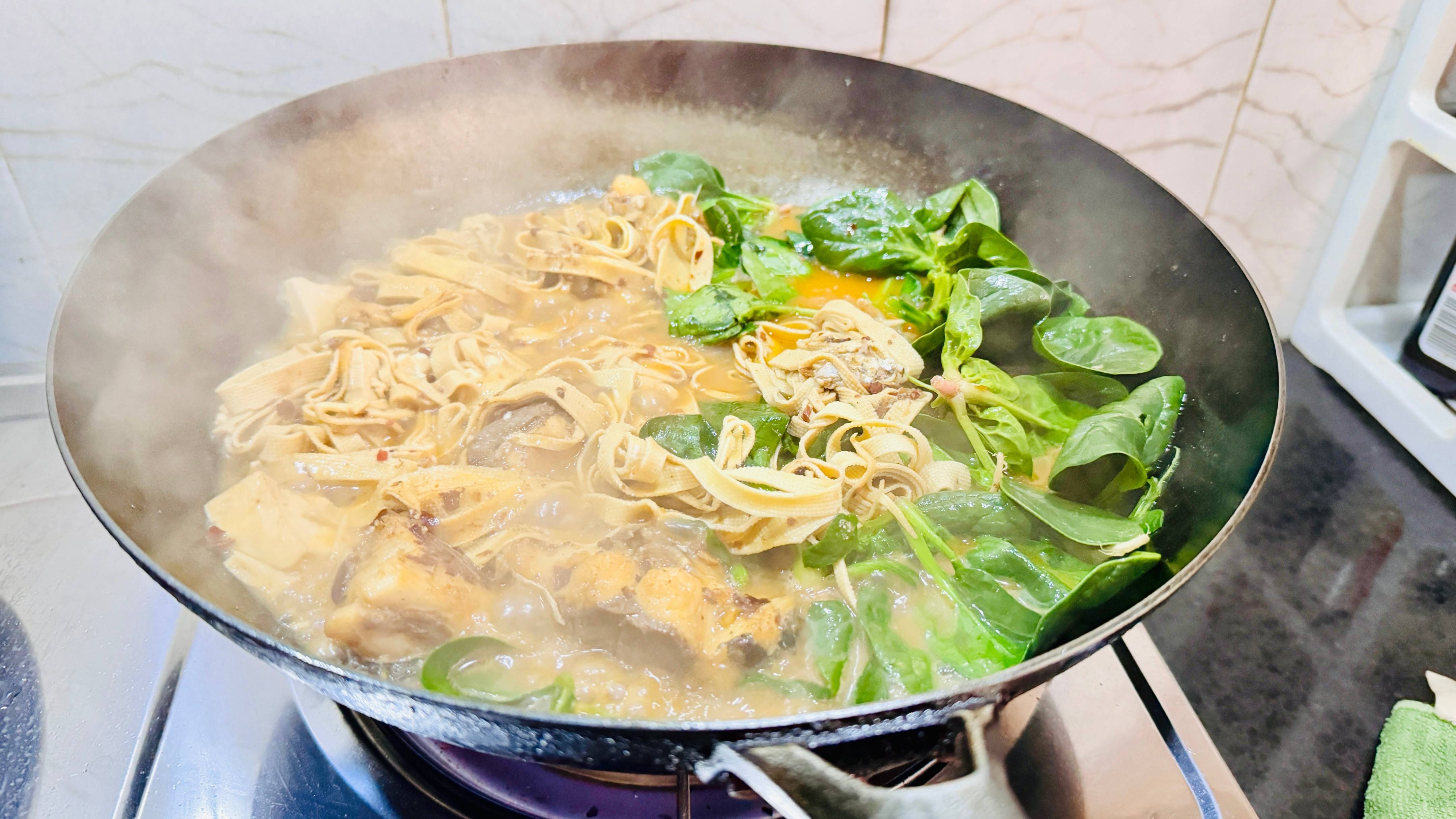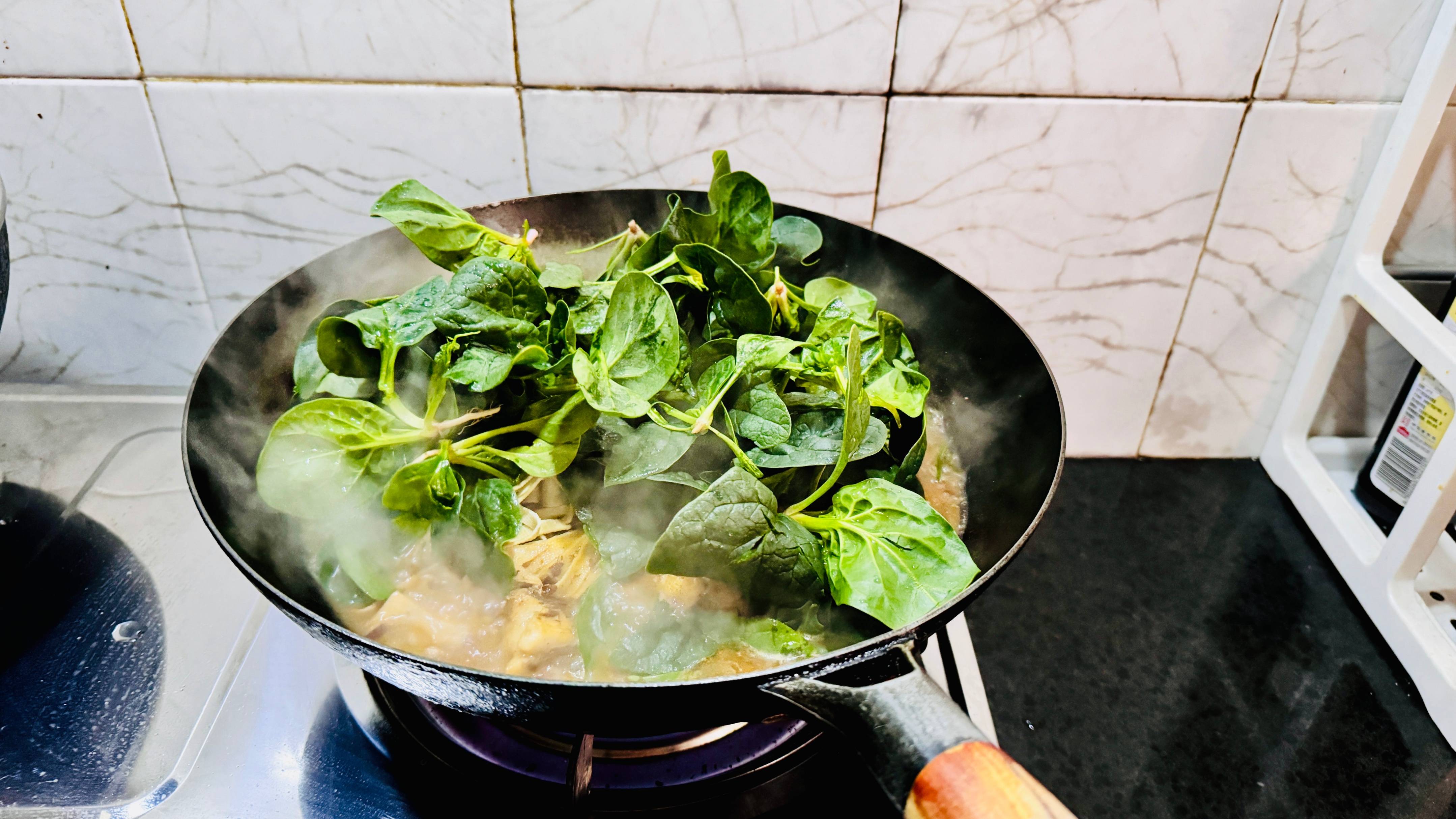 最后再放小菠菜,菠菜不需要煮太久,烫熟了就可以关火直接端上桌了,因为没有另外烫别的食材就直接一锅出了不需要用电子锅,煮好了之后直接上桌就可以吃了。