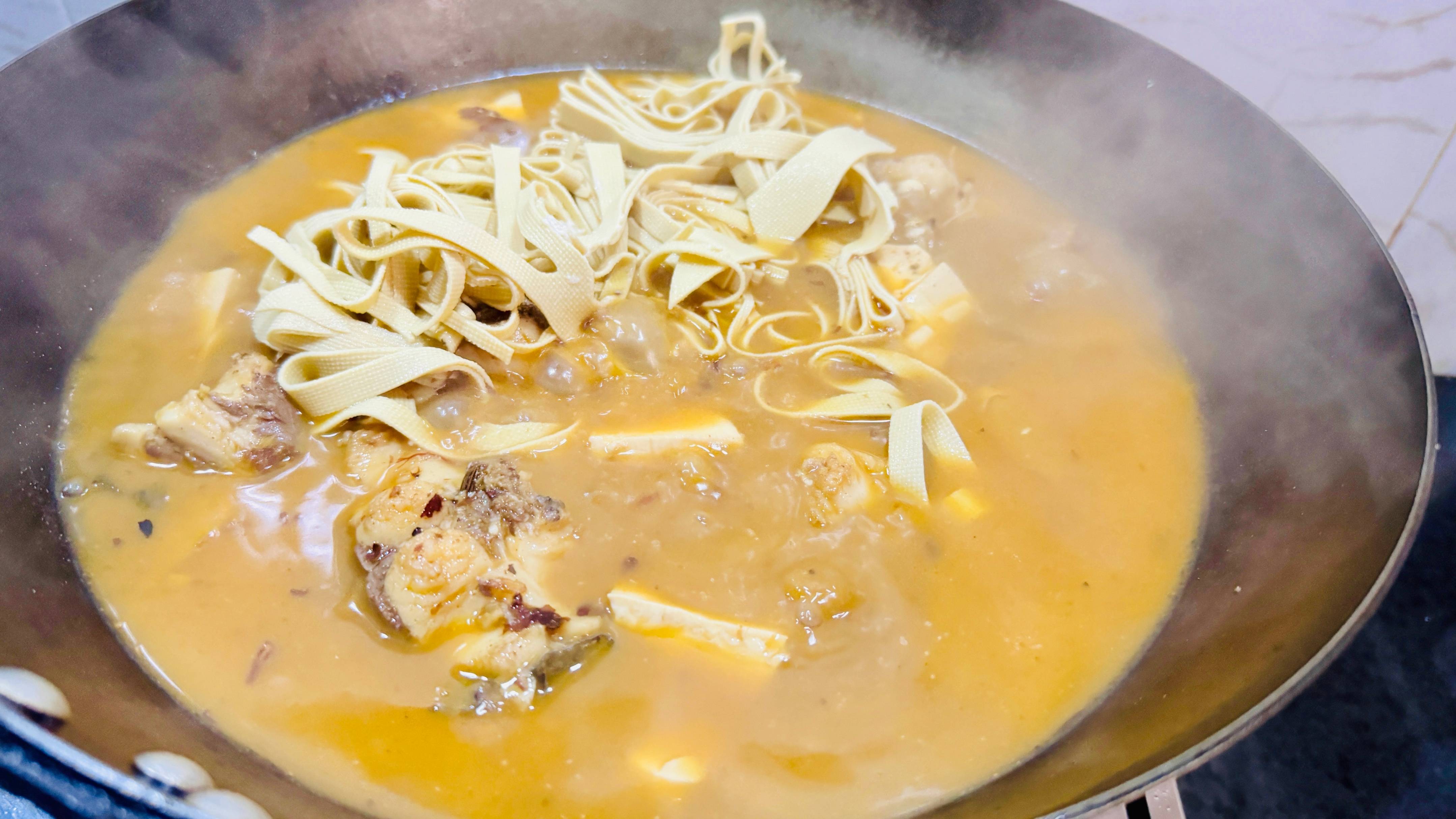 加入老豆腐,千张丝放一起煮,都说千滚豆腐万滚鱼,多煮一下就更好吃了。