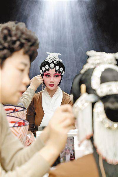 演员登台前进行化妆造型。