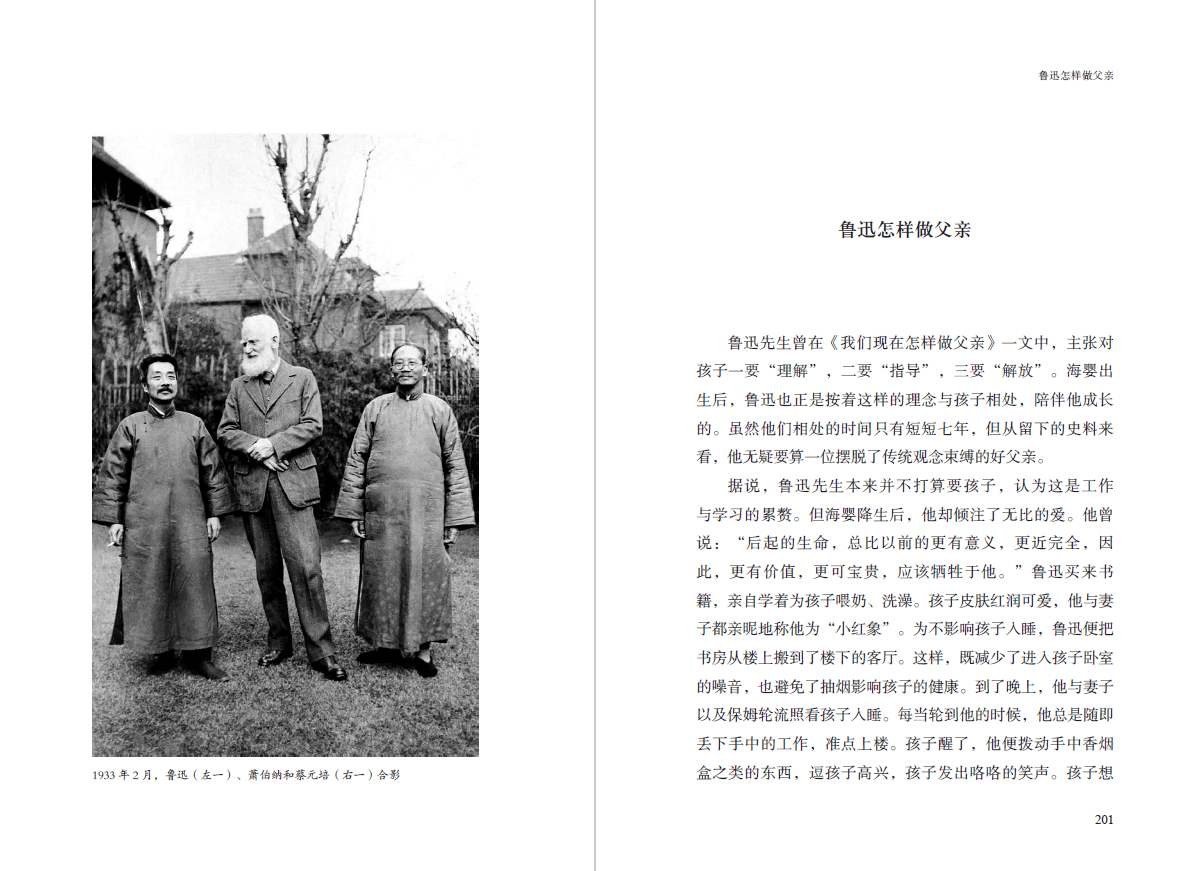 鲁迅先生曾在《我们现在怎样做父亲》一文中,主张对孩子一要“理解”,二要“指导”,三要“解放”。海婴出生后,鲁迅也正是按着这样的理念与孩子相处,陪伴他成长的。虽然他们相处的时间只有短短七年,但从留下的史料来看,他无疑要算一位摆脱了传统观念束缚的好父亲。