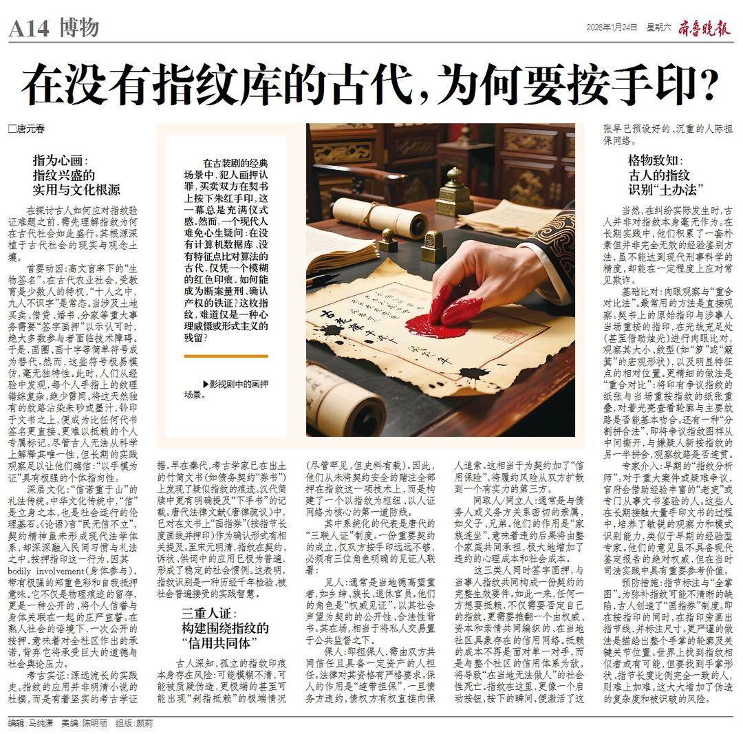 专家介入:早期的“指纹分析师”。对于重大案件或疑难争议,官府会借助经验丰富的“老吏”或专门从事文书鉴验的人。这些人在长期接触大量手印文书的过程中,培养了敏锐的观察力和模式识别能力,类似于早期的经验型专家。他们的意见虽不具备现代鉴定报告的绝对权威,但在当时司法实践中具有重要参考价值。
