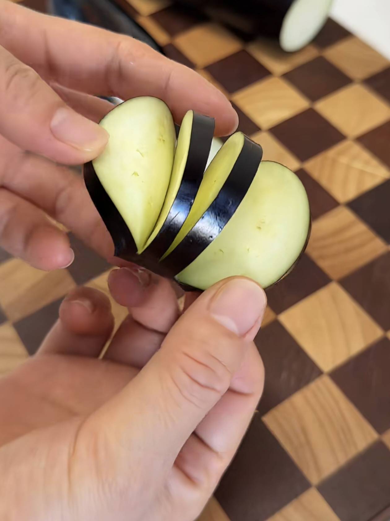 茄子洗净去蒂,第一刀切到2/3处不要切断,第二刀直接切断,形成“茄子夹”。小妙招:刀刃蘸点水再切,茄子不容易打滑,切口更整齐。