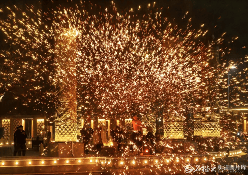 1月10日晚,非遗打铁花在吐鲁番市高昌区人工湖精彩上演。刘健摄