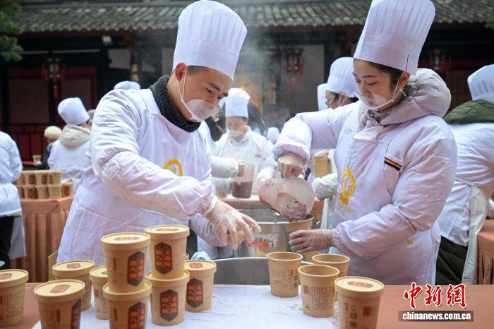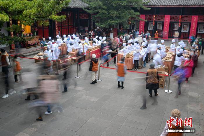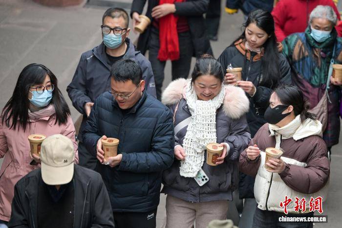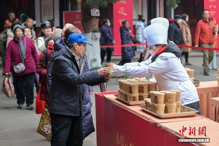 1月25日,农历腊月初七,四川成都文殊院内腊八粥香气弥漫,腊八奉粥活动吸引众多游客与民众有序排队领取。一杯杯热气腾腾的粥品,不仅承载着人们对团圆的美好期盼,更让延续百年的民俗在欢声笑语中焕发新生,为即将到来的马年新春提前奏响温暖序曲。图为文殊院腊八奉粥活动现场。中新社记者 刘忠俊 摄
