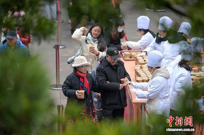 图为民众在文殊院腊八奉粥活动现场领取腊八粥。中新社记者 刘忠俊 摄
