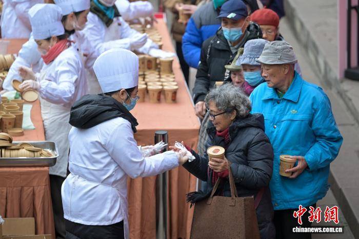 图为民众在文殊院内领取腊八粥。中新社记者 刘忠俊 摄