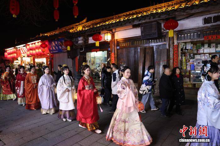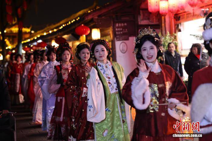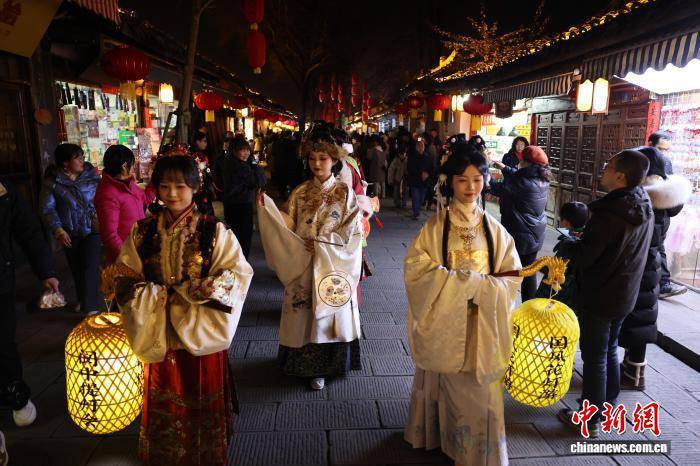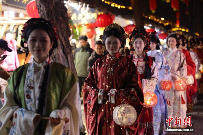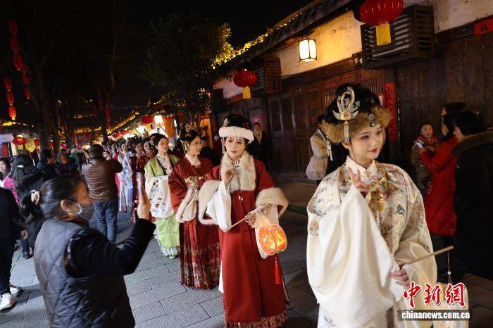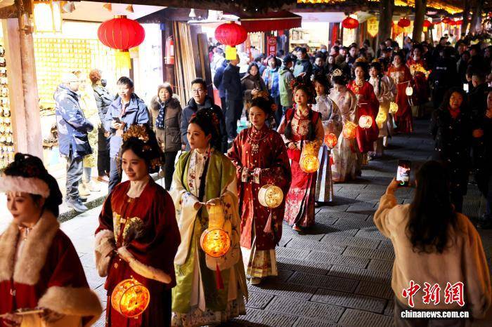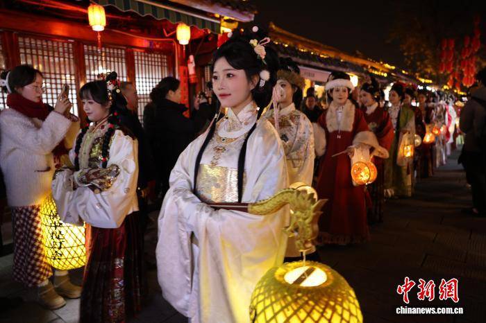 1月25日晚,四川阆中,一群身穿汉服的女性表演者手提花灯,沿着阆中古城街巷进行巡游,吸引各地游客围观。中新社记者 张浪 摄