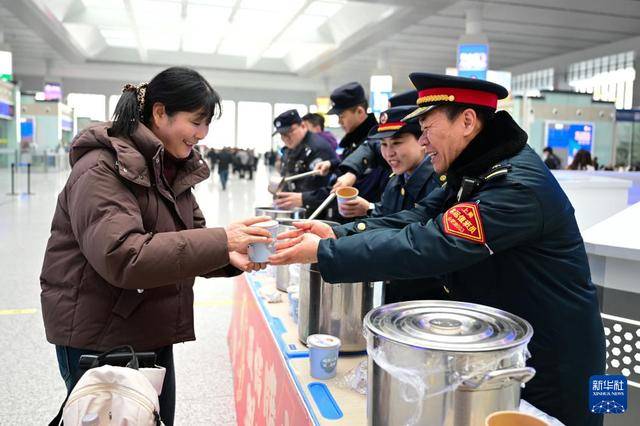 1月25日,在合肥南站候车大厅,工作人员将腊八粥送给旅客。