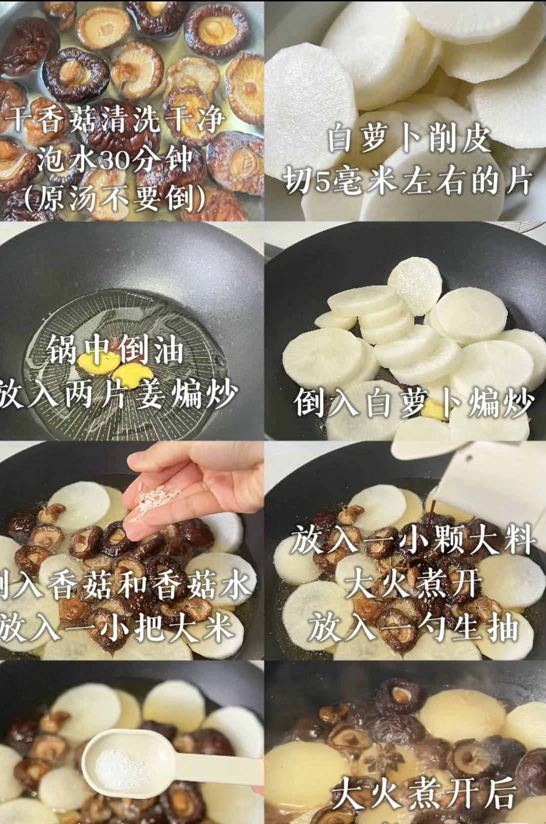 首先,我们需要准备一些基本的食材:新鲜的白萝卜、干香菇、姜、大料和一些调味料。白萝卜去皮后切成大约5毫米厚的片,这样既能保持口感,又能确保在烹饪过程中充分吸收汤汁的味道。干香菇则需要提前30分钟用清水泡发,泡发后的香菇水不要倒掉,因为这是制作汤底的关键。接下来,我们开始烹饪。在锅中倒入适量的油,放入两片姜进行煸炒,直到姜片边缘微微泛黄,散发出诱人的香味。这时,将切好的白萝卜片倒入锅中,用中火慢慢煸炒,直到萝卜片表面微微透明,这样可以让萝卜片更加入味。然后,将泡发好的香菇和香菇水一起倒入锅中,加入一小把大料,这样可以增加汤的香气。接着,加入适量的清水,水量要足够覆盖所有食材。大火烧开后,转小火慢炖,让食材的味道充分融合。在炖煮的过程中,我们可以加入一些调味料来提升汤的味道。适量的盐和一勺生抽是必不可少的,它们可以让汤的味道更加鲜美。如果你喜欢更浓郁的口感,还可以加入一些鸡精或者味精。
