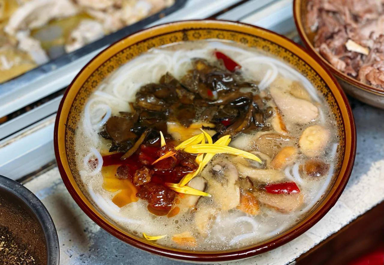 吃的时候,将米线装入碗中,浇上滚烫的菌汤,加少量肉末、青菜、豆腐皮,撒上葱花、胡椒粉。菌汤鲜醇回甘,米线劲道爽滑,野生菌的鲜香渗透每一根米线,一口下去鲜得眉毛都要掉下来,既暖身又补营养,是丽江人对 “鲜” 的极致追求。