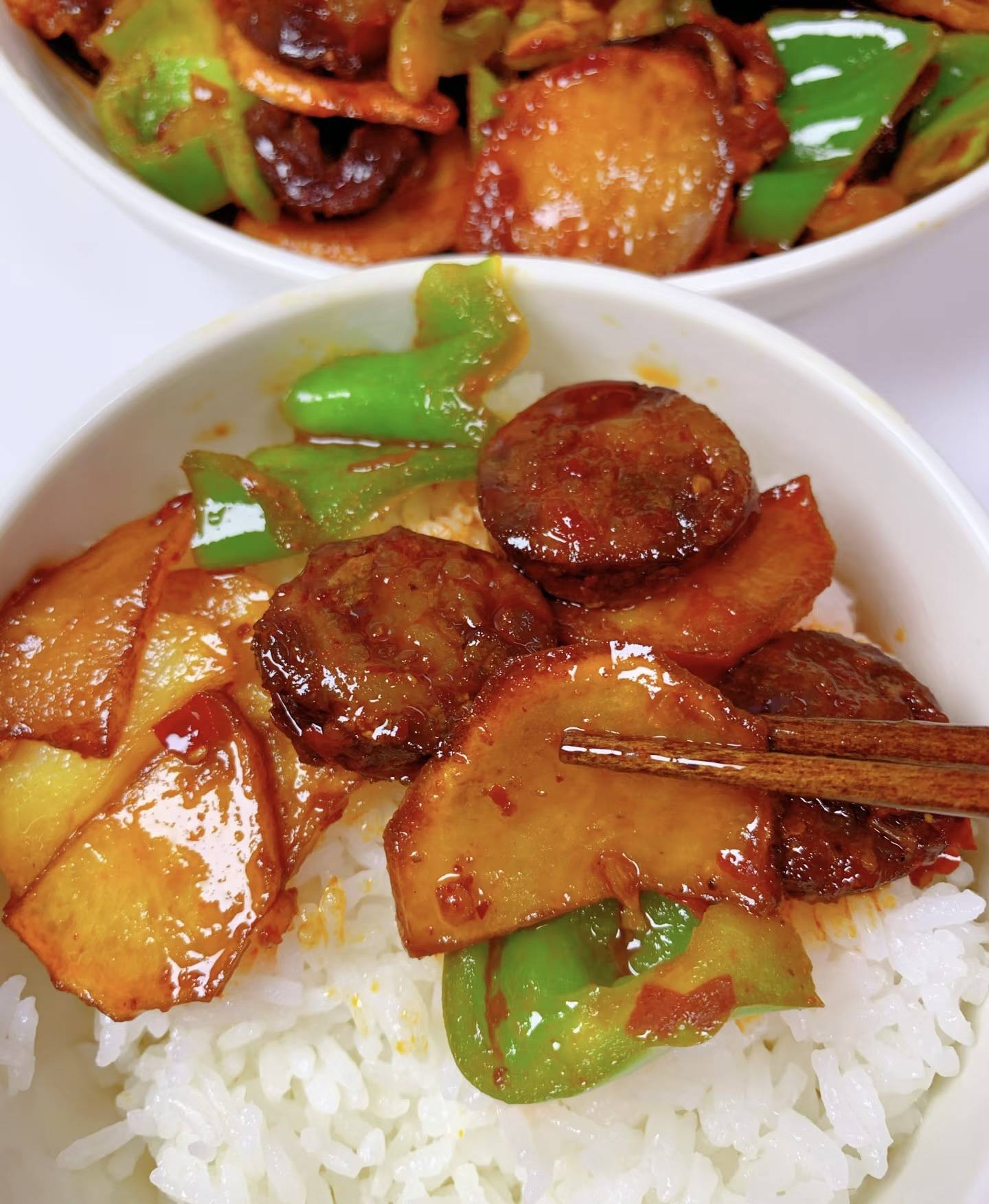 最迷人的时刻,是开盖后转大火收汁。这时候要不停翻炒,直到汤汁变得浓稠,紧紧挂在土豆和腊肠上,撒上配菜快速断生,最后淋一圈香油,关火!端上桌时,锅里的食材还在滋滋作响,土豆片外层焦香、内里软糯,咬一口能尝到腊肠的咸甜,配菜的清爽刚好中和了油腻,连盘底的酱汁都要用勺子刮干净。