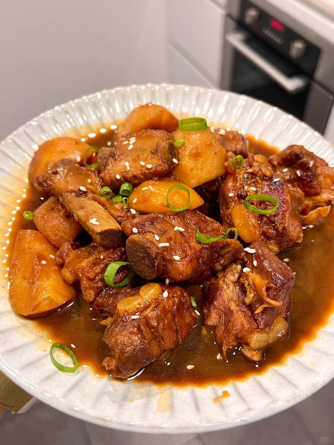 最绝的是收汁技巧: 最后15分钟开盖收汁,边收边往排骨上淋汁。这样做出来的排骨裹着琥珀色的酱汁,放凉了也不会发柴。我老公说这招让他带的便当排骨成了办公室的硬通货,同事们都抢着用零食跟他换。