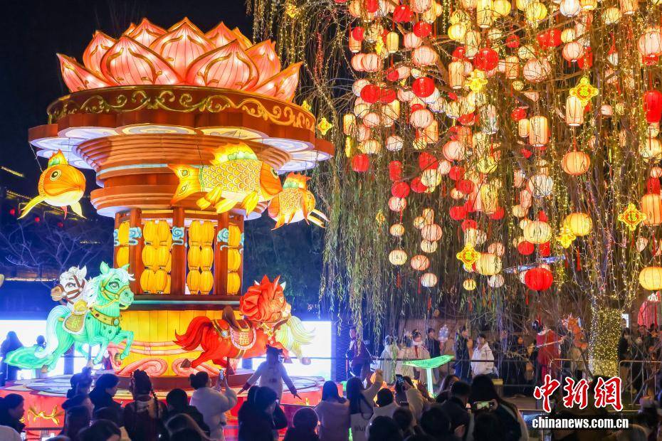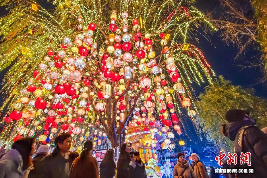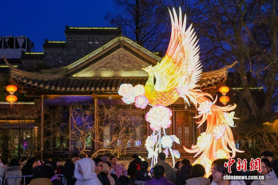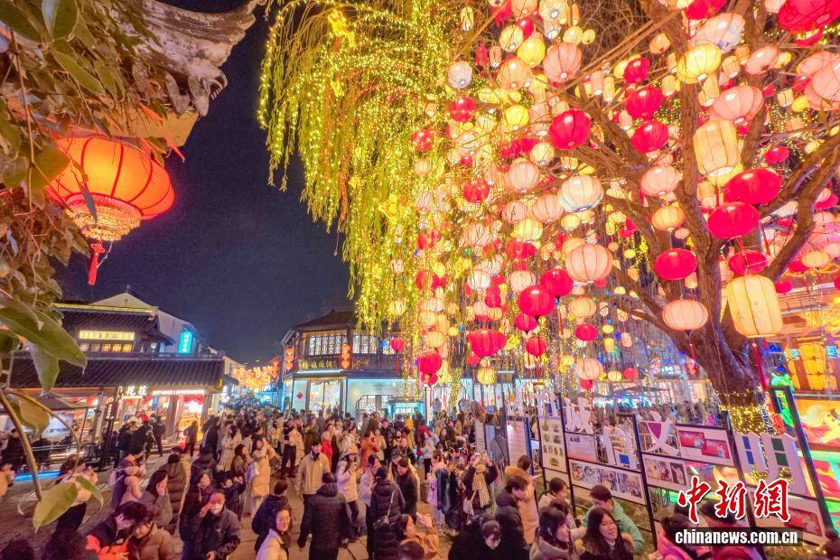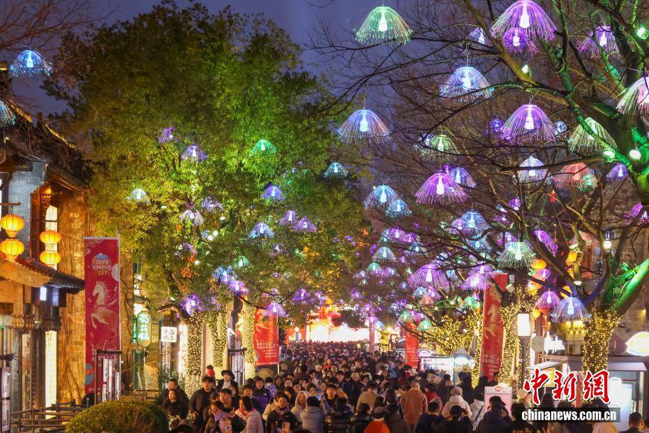 1月28日晚,江苏南京,市民和游客在彩灯璀璨的城南老街上游玩。春节临近,南京城南街头巷尾安装的大型灯组、各式彩灯陆续亮灯,“盛装打扮”营造节日氛围。中新社记者 泱波 摄
