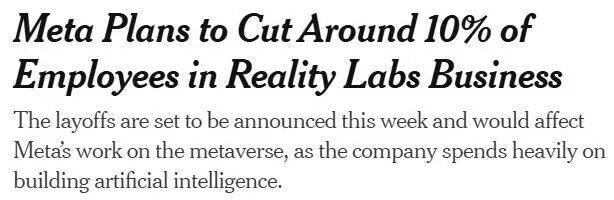 几乎在同一时间,Meta 宣布对 Reality Labs 裁员约 10%,涉及人数约 1,500 人。这个部门主要负责 VR、AR 与元宇宙业务,目前规模约 15,000 人。