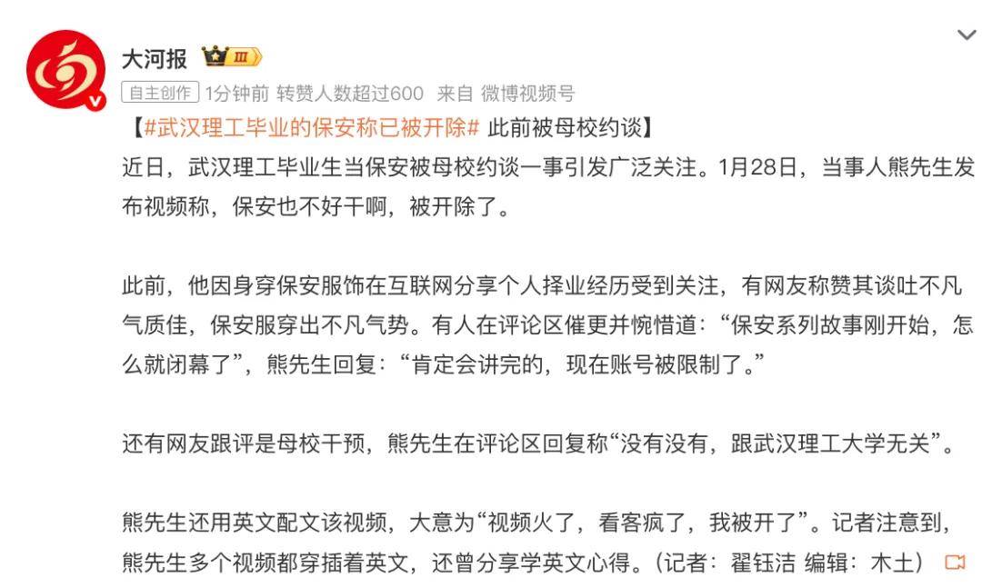 不过,好在这位武汉理工毕业的保安站了出来澄清被母校约谈真相,称母校只是关心并未干涉,从而证明并非真被母校约谈,母校只是只是通过辅导员关心他的 经历,本以为该事件到这里就结束了,没想到这位211毕业生又发声,称“视频火了,看客疯了,我被开了”,也就是说他被开除了,很快该消息再次引起网友热议,有网友甚至认为是其母校在搞鬼,不过好在他回复称“跟武汉理工大学无关”,算是及时为母校证明清白。