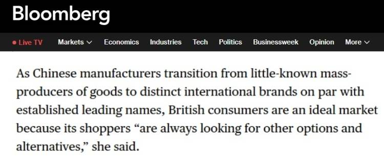彭博社网站的报道指出,相比美国的贸易保护主义政策,英国对中国贸易持开放态度。报道援引中英贸易协会零售和电子商务部门主管唐赛琳(音译)的观点指出,在英国市场,消费者欢迎任何能提供优质产品和物有所值的优秀品牌。她表示,随着中国制造商从鲜为人知的商品生产者转型为与国际知名品牌比肩的独特品牌,英国消费者成为其理想的目标市场,因为当地买家“始终在寻求更多选择和替代方案”。