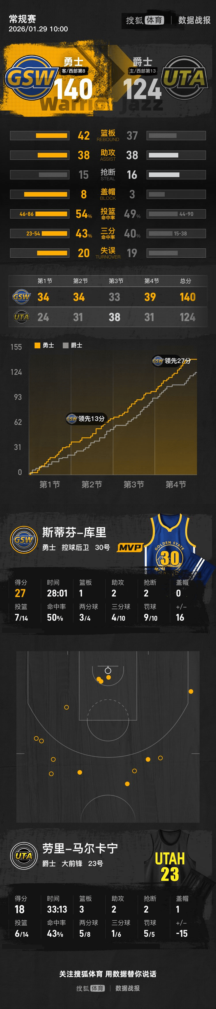 最后一节,勇士趁势展开进攻火力,将分差迅速扩大至27分。虽然在小节后段,爵士逐渐找回状态,努力将比分拉近,但最终未能挽回败局。比赛结束,勇士以140-124战胜爵士,成功取得胜利。